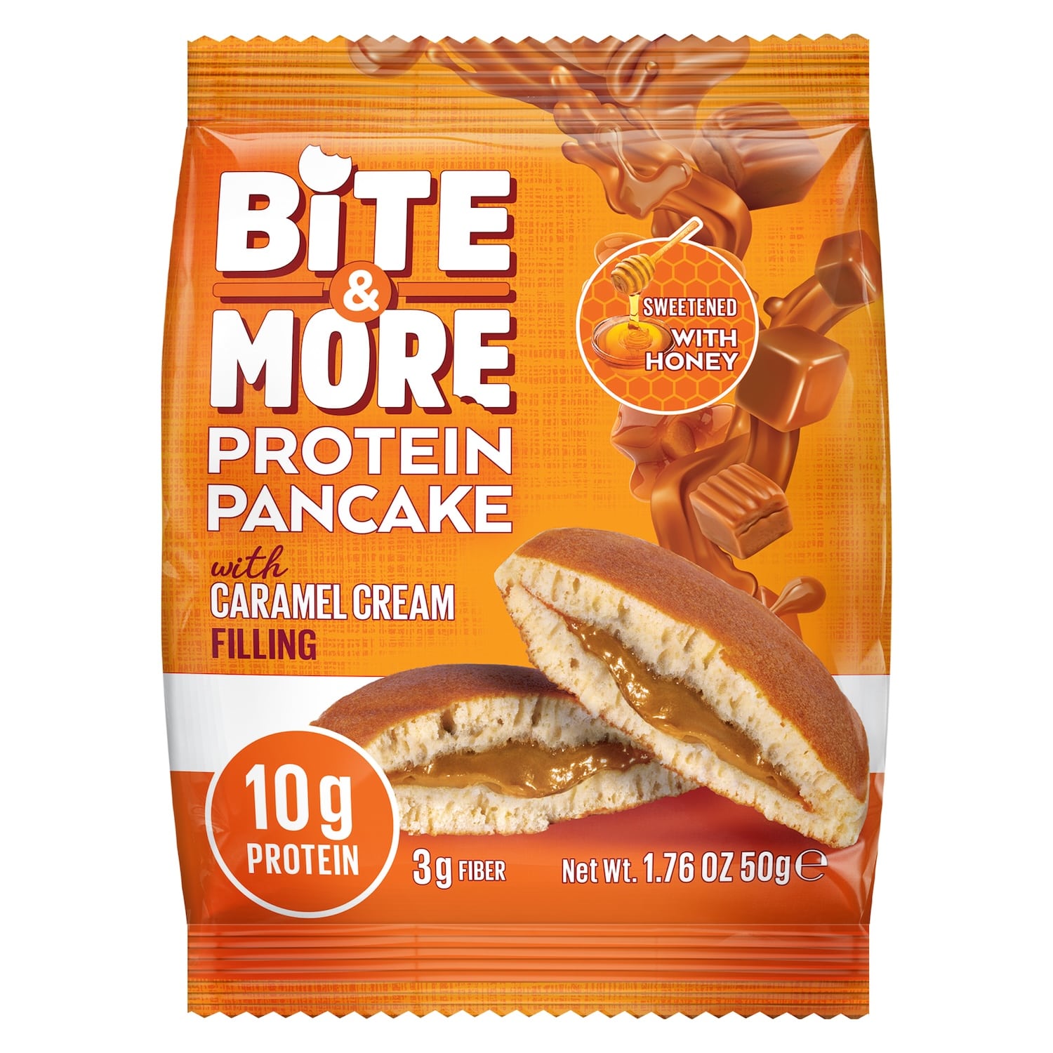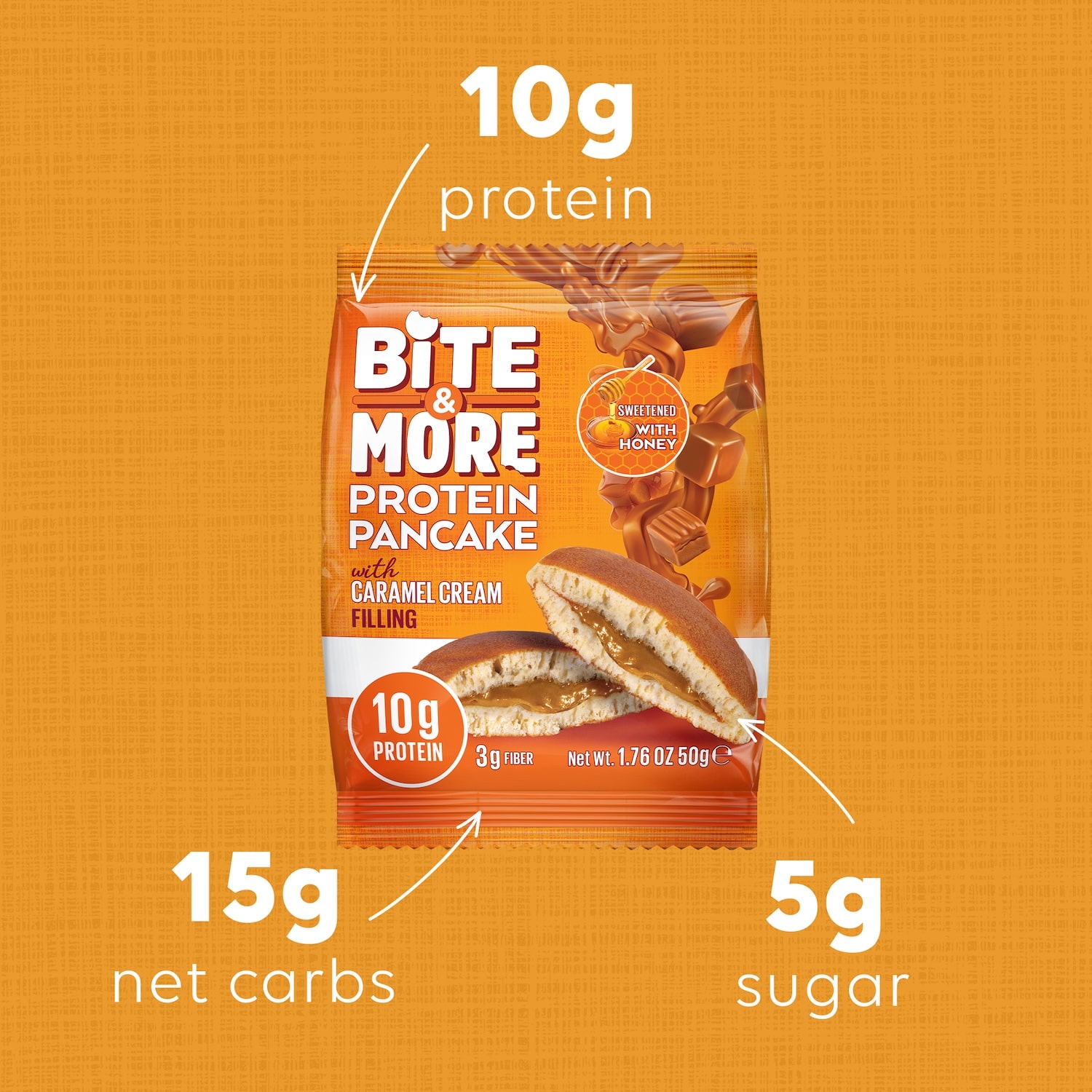 Bite & More Caramel Pancake delivers the high protein and balanced nutrition you need throughout the day—without compromising on taste. With its soft vanilla pancake batter and caramel cream filling, this treat stands out by offering both indulgence and a satisfying, nourishing snack alternative.