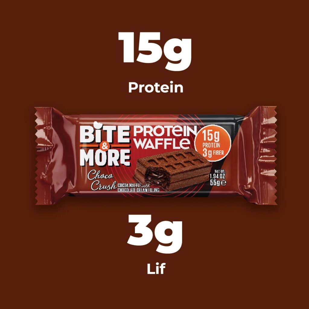 Bite & More Chocolate Protein waffle delivers the perfect balance of light crispiness and rich cocoa flavor. With 20% protein, this snack helps you stay energized and satisfied, offering a guilt-free way to enjoy chocolate. Designed for busy lifestyles, it’s the ideal treat for office breaks, pre- or post-workout recovery, or simply when sweet cravings hit.